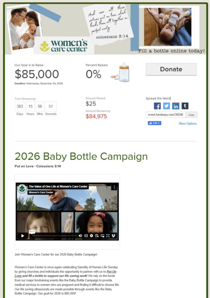 The Baby Bottle Campaign is an easy way for churches to support Women’s Care Center. This event kicks off primarily twice a year: Sanctity of Human Life Sunday (January) and Mother’s Day (May).